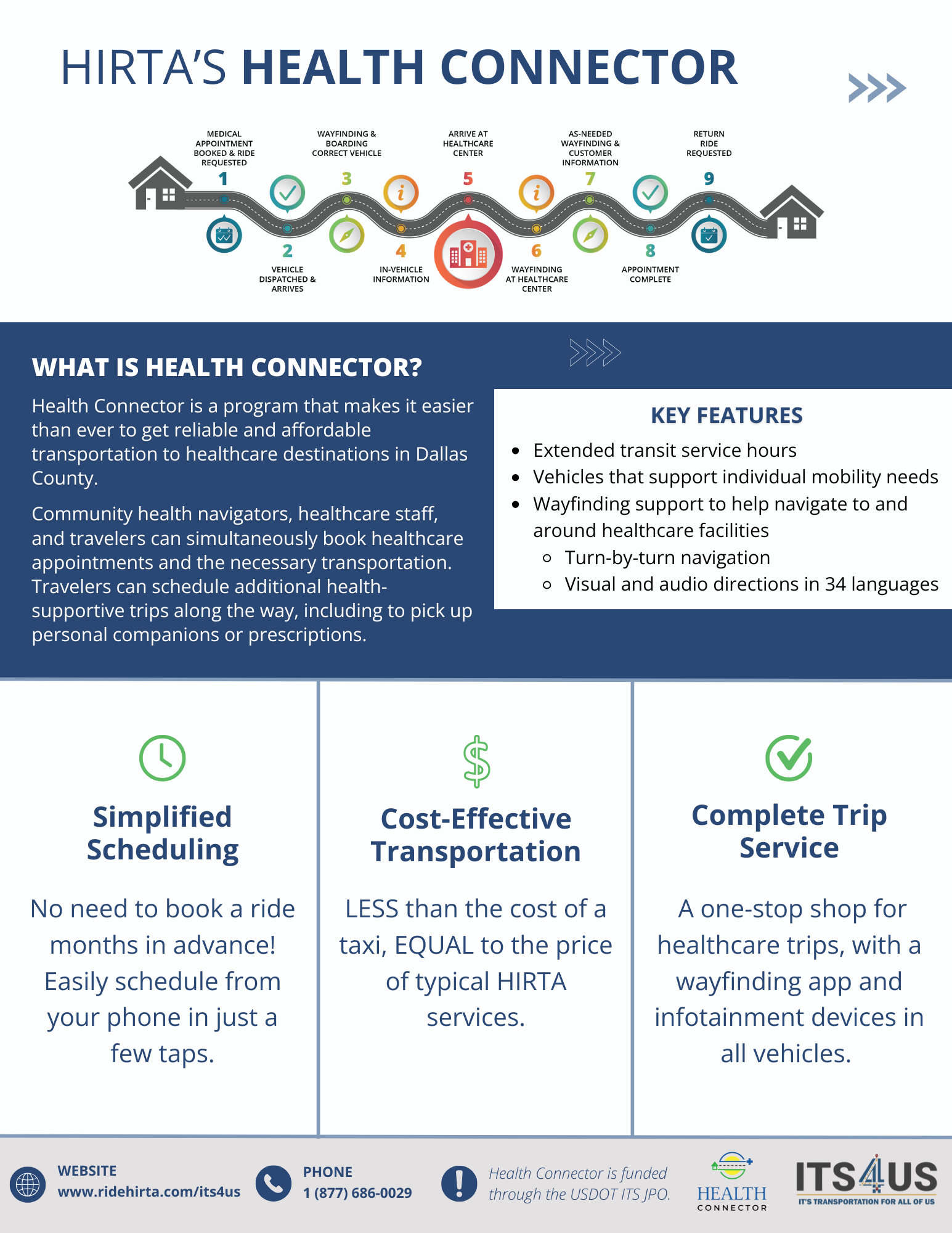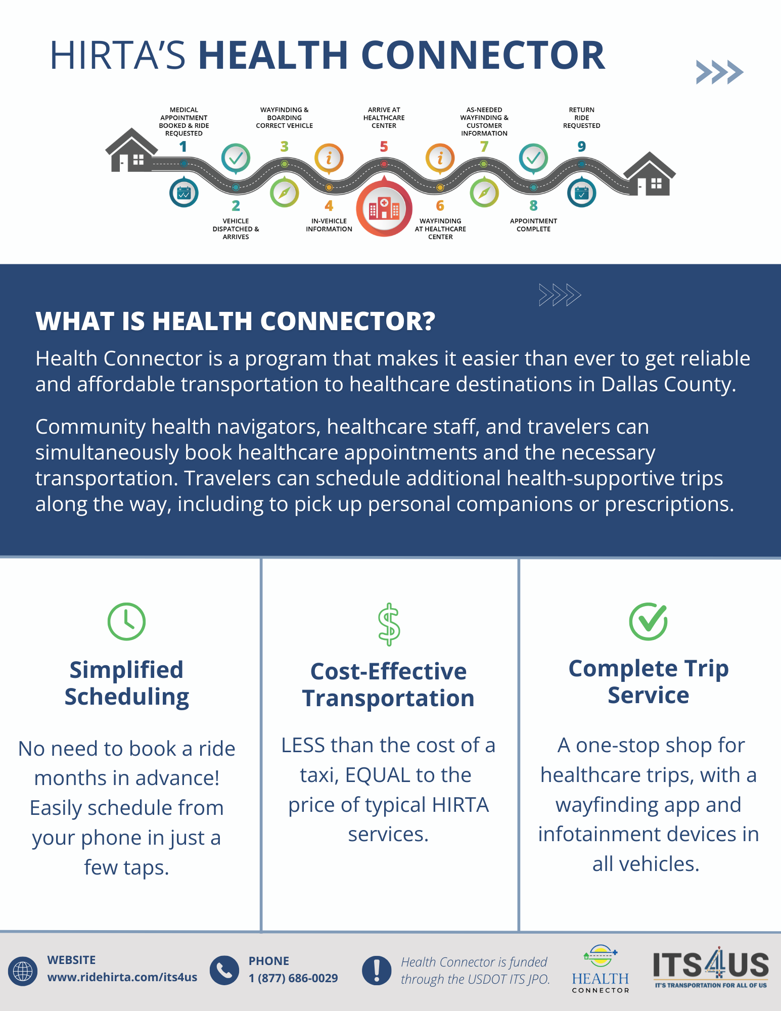 The U.S. Department of Transportation Intelligent Transportation Systems (ITS) Joint Program Office (JPO) awarded HIRTA a pilot under the ITS4US Deployment Program for its proposed Health Connector concept, which will introduce an innovative solution to address challenges in transportation access to healthcare for HIRTA communities.
